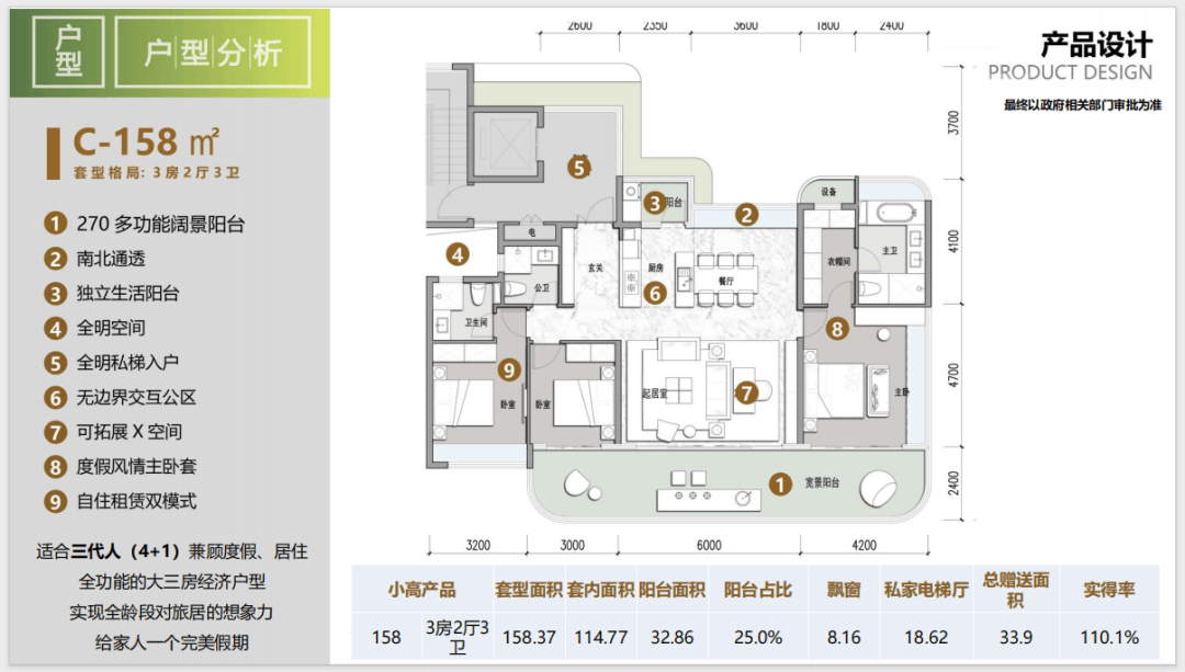 在户型方面,大阳台搭配独立电梯入户、度假氛围很强,得房率最高能达到110%。