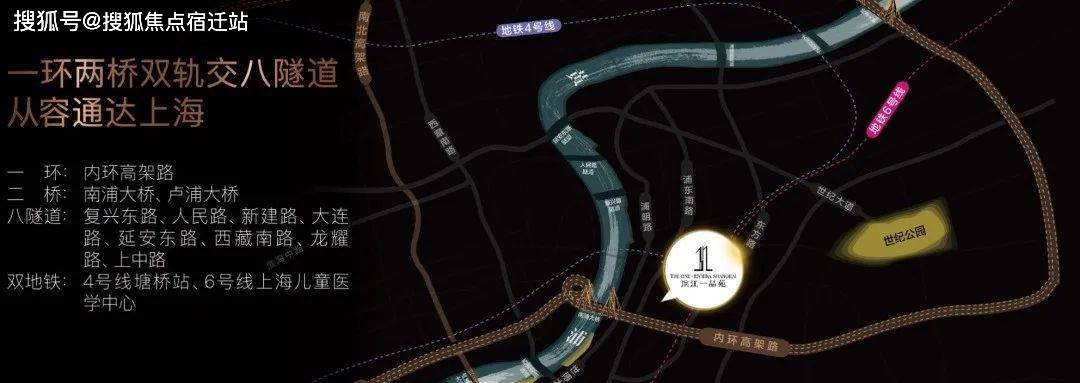 1环2桥2隧道双轨交:内环内,南浦大桥、卢浦大桥,复兴路隧道、人民路隧道,门口轨道交通4/6号线。