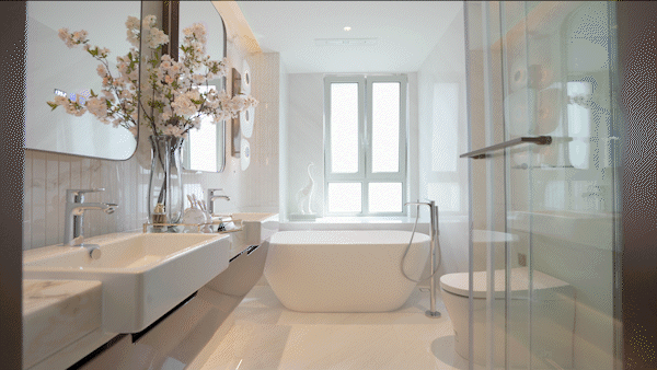,显得整个空间明亮雅致。室内也有大量石材,比如卫生间墙面主角是南斯拉夫白,建面188㎡K户型主客卫洗台背景墙使用的是
