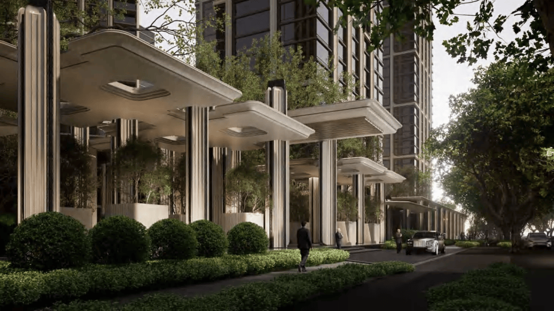中段以浪白与夕阳金游艇舱勾勒出270°江景画框,下段石材柱廊则向上生长出ART-DECO经典线条。巧妙化用风帆意象,打造的